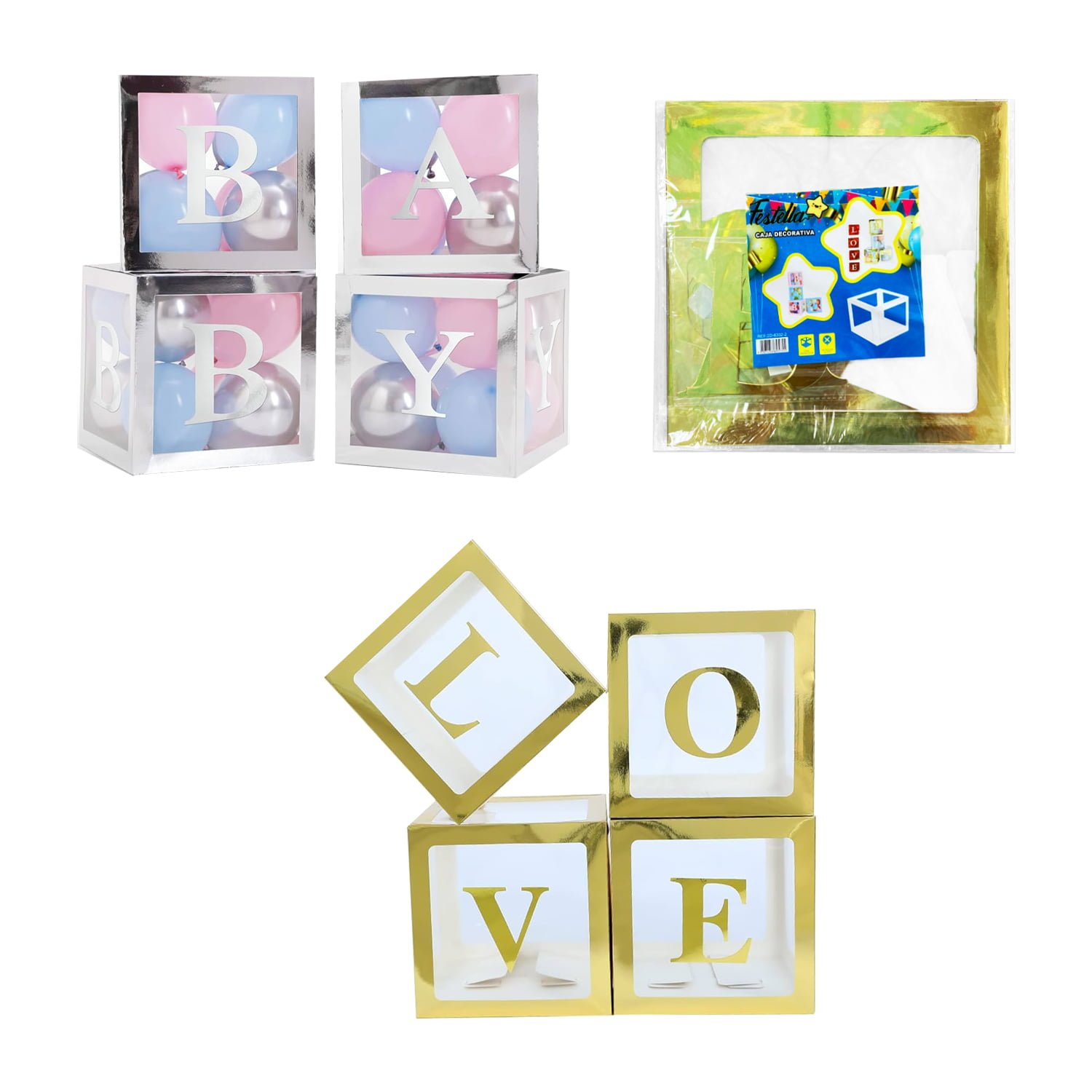 Incluye palabras love y baby en tonos metalizados, ideal para tus celebraciones especiales.